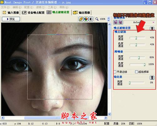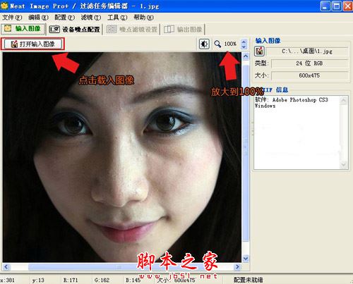 第二步,我们打开NEAT IMAGE滤镜,载入PS里处理好的图片。并放大到100%,以便容易观看效果!