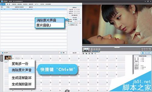 将视频导入爱剪辑之后,选中要消除原片声音的视频片段,在主面板中央的“声音设置”栏目中,把“使用音轨”选择为“消除原片声音” 。或者在“已添加片段”列表,选中片段缩略图,单击鼠标右键,在弹出的菜单栏中选择“消除原片声音”(快捷键为“Ctrl+W”)。