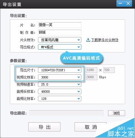 配音视频制作完成后,点击“导出视频”按钮,在弹出的“导出设置”对话框中,设置好导出的分辨率和比特率(PS:一般720P的MP4格式,比特率最好为3500Kbps以上),即可快速导出自己的配音作品!