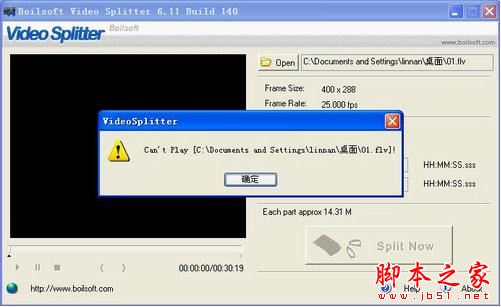 目前该软件的汉化版本也已经发布,所以还是建议大家使用最新的汉化版。软件使用起来很简单,首先直接把要剪辑的视频或音频拖放到主界面上,大部分格式都是支持直接预览的,但是 .flv 等少数格式载入后,软件会弹出提示无法预览(图2),但这并不影响剪辑。