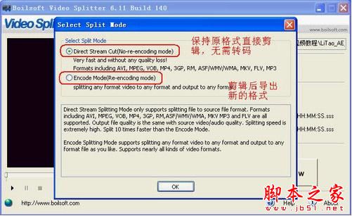 Boilsoft Video Splitter提供了自动和手动两种剪辑方式,默认选择后者。在这种剪辑方式下,用户可以通过拉动时间轨上的滑块或者在右侧直接输入时间(.flv格式只能采用后者),然后分别点击“{”或“}”按钮确定开始和结束的时间点,最后点击“Split now”开始剪辑。软件会先提示选择保存输出文件的位置,确定后软件询问是否转换文件格式(图3);