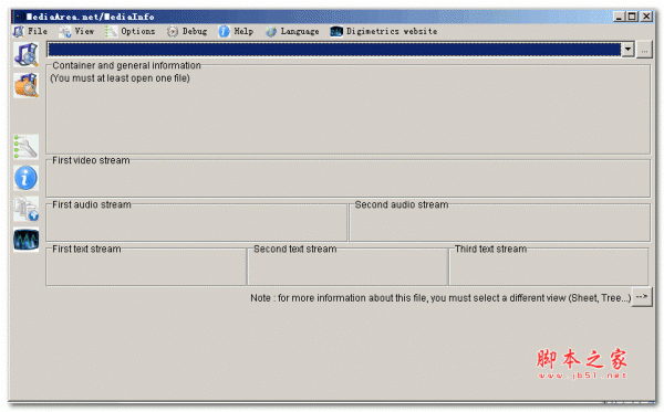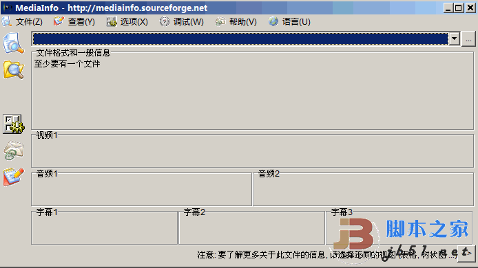 选好中文后,点击确定按钮这时就跳转到了Mediainfo的主界面啦,你可以熟悉一下该款软件的大体情况,比如:文件添加、查看方式、参数设定等等。