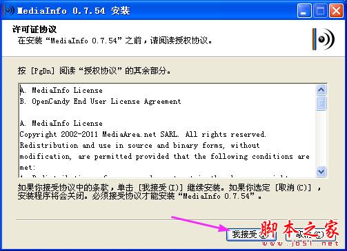 选好语言之后,点击安装,这时跳转到Mediainfo授权协议界面,一般在安装软件的时候都是要接受协议才可以安装完成的,点击“我接受”按钮,进行安装。