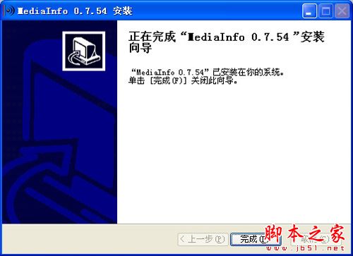 安装到最后一个界面时,这时你可以看到上面的提示“ Mediainfo 0.7.54已安装在你的系统上”,证明Mediainfo已经安装到了电脑上,这时你就可以用来查询视频参数了。