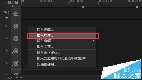 2、在覆叠轨1上右键单击,选择“插入照片”;