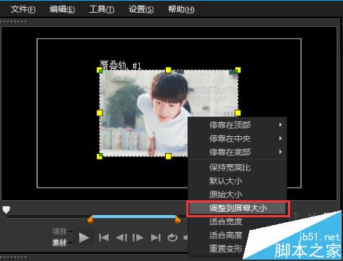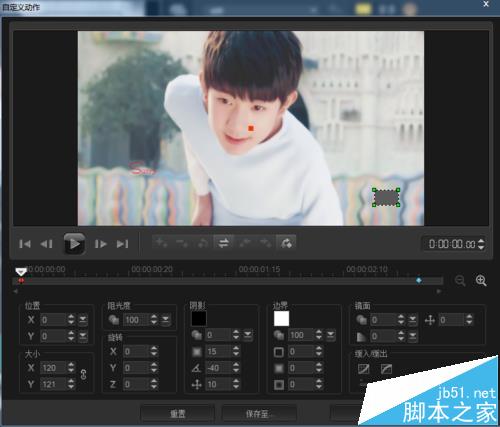 13、在覆叠轨1的图片上右键单击,选择“自定义动作”,在自定义动作对话框中,设置起始帧大小里面的X轴数值为120,终止帧同样设置为120。