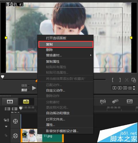 6、在覆叠轨1的图片上右键单击,选择复制。然后在覆叠轨2上右键单击选择粘贴,将图片复制到覆叠轨2上;