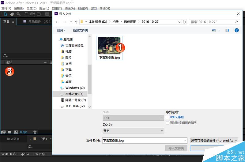 第一步,打开AE,导入图片。如图所示,可以通过菜单文件>导入,或者直接拖拽图片到项目面板。