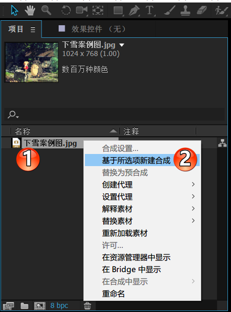 第二步,新建合成。如下图所示,右键单击案例图片,再弹出的菜单中选择"基于所选项新建合成"。此时,就可以看到时间轴面板上有以图片名称命名的合成了。