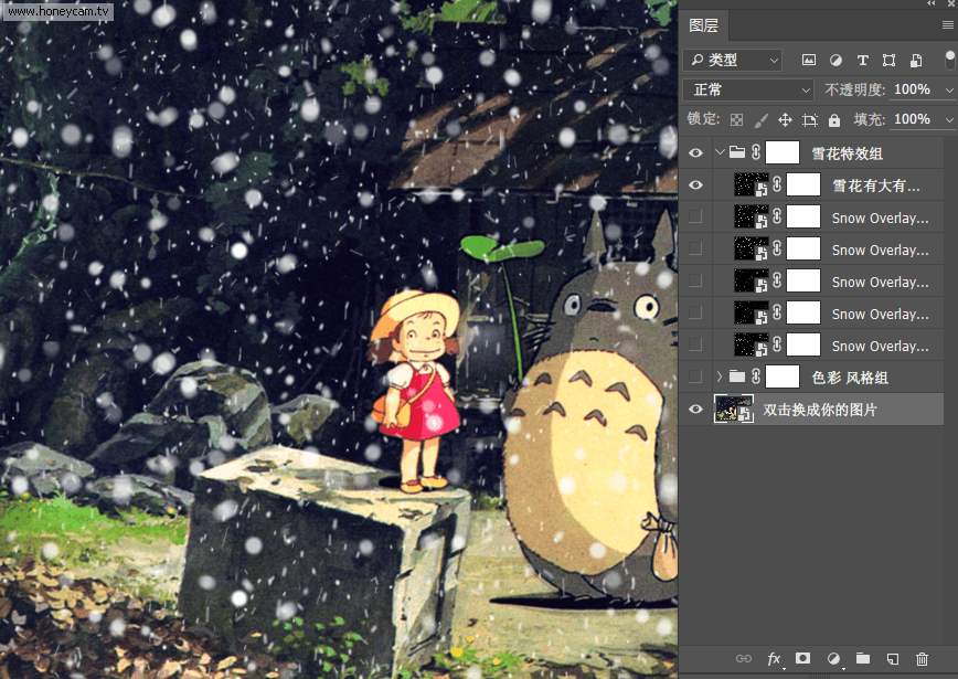 第二步,从雪花效果组中选择一个喜欢的效果,勾选该图层。