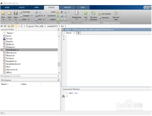 1.首先打开Matlab(本人使用的是Matlab 2015a,使用其他版本的Matlab影响不大)。在Common Window里输入edit fun(fun可改为任意字符,只为演示用),打开M文件编辑器,此时已创建M文件,文件名为fun。