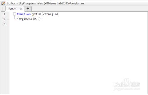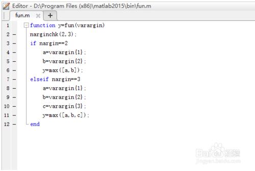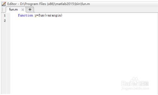 2.在编辑器内输入 function y=fun(varargin),varargin是Matlab内部变量,类型为元胞数组,如果改为其他变量则会报错。