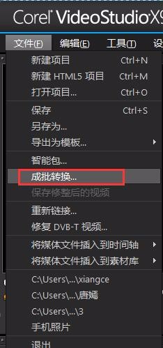 1、打开会声会影之后,在文件菜单栏中选择“成批转换”