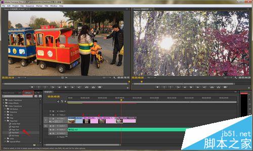 9、我们还可以从左侧的“Effects”中找到视频和画面转场的效果,比如3D的、翻页纸的等等,将其用鼠标拖入到两个素材之间的地方即可完成添加,如图所示。如果需要改变转场效果的属性,可以选中转场效果,从其属性栏中进行修改。