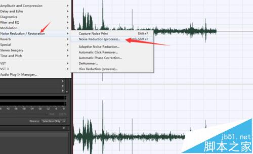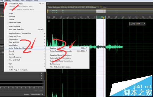 4、之后全选音频,同样选择效果,降噪,降噪进程,就可以了,你可以看到红绿,如图不满意,可以微调一下,
