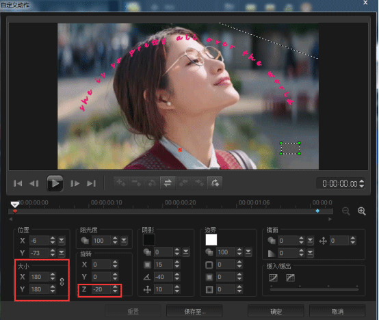 图片制作好之后就可以导入到会声会影中了。在图片上右键单击选择“自定义动作”,在自定义动作对话框中调整大小还有旋转值,旋转到文字位于正上方为止,大小适当,可以看到小编自己制作时已经将大小调到了180。