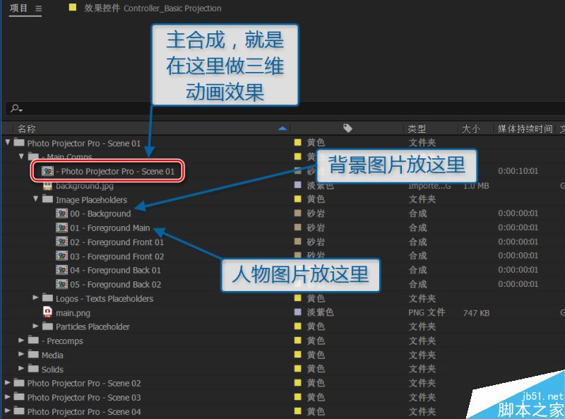 打开AE,打开该模板后,会在项目面板上非常清楚地看到它的组成,内置了很多个场景合成,他们构成都是一样的,打开后有很多合成,重要的是下图所标出来的主场景合成、背景合成、主前景合成,所以重要的就是按图中所说把背景和人物图片分别导入所属合成。
