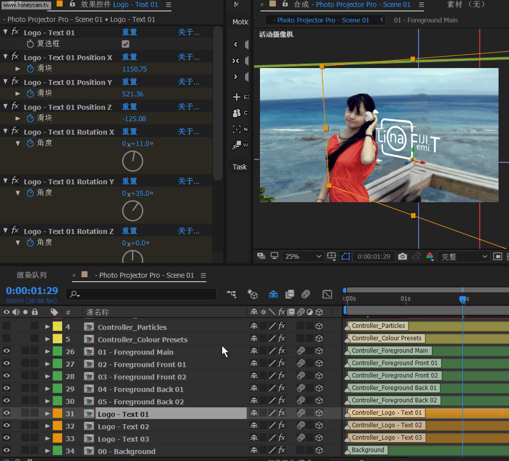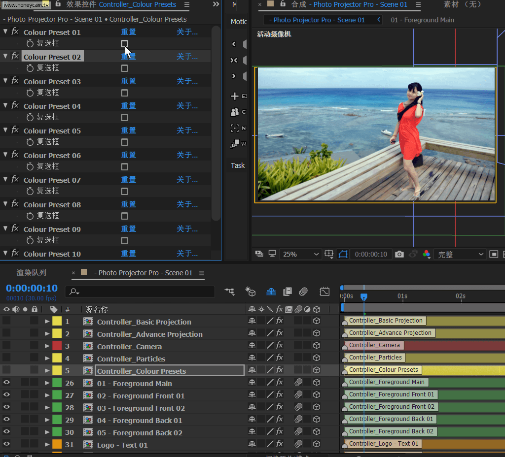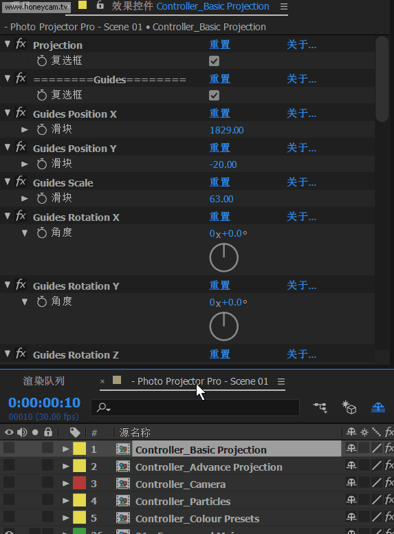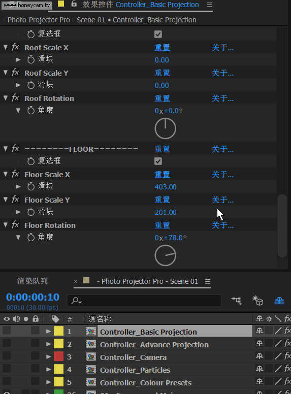这一步是实现三维视差效果的关键。 打开"Photo Projector Pro - Scene 01"合成,然后在时间轴面板选中"Controller_Basic Projection",则可以在效果空间面板上看到所有的空间设置参数了,非常详细地设定了坐标轴位置、地面、天空、背面、左侧、右侧等,每一项都准备了大小、位置、旋转等参数的调整,并在视图预览中以颜色块显示,非常方便调节。
