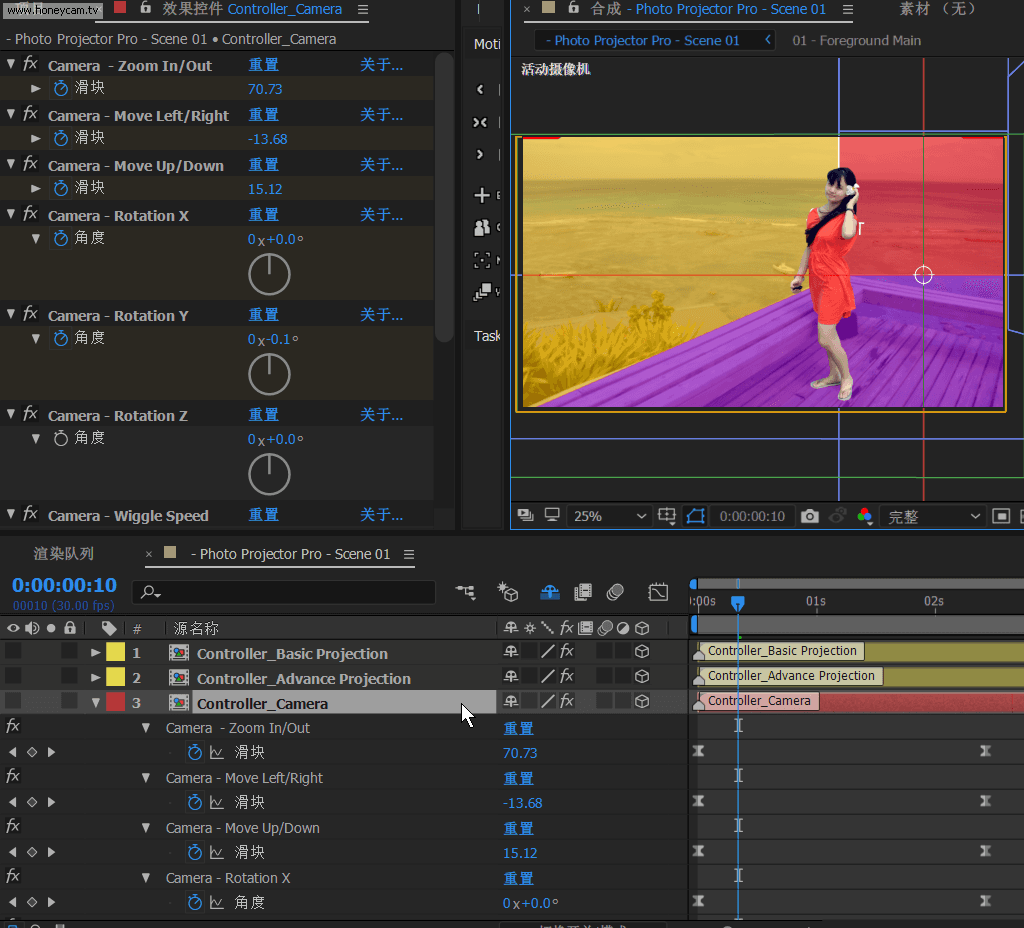完成上述五步后,即可选择"Controller_Camera"图层,来做动画效果了,依然是做摄像机运动,因为是模板嘛,所以新建摄像机那些操作就不用做了。直接在图层中针对摄像机运动做关键帧动画即可,如下图所示,在0秒的时候设定一个镜头参数,然后在最后一秒的时候设定结束镜头,这个设定完成后,点击空格后即可预览效果。