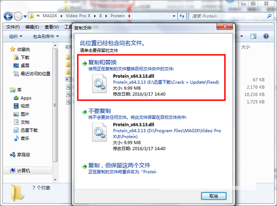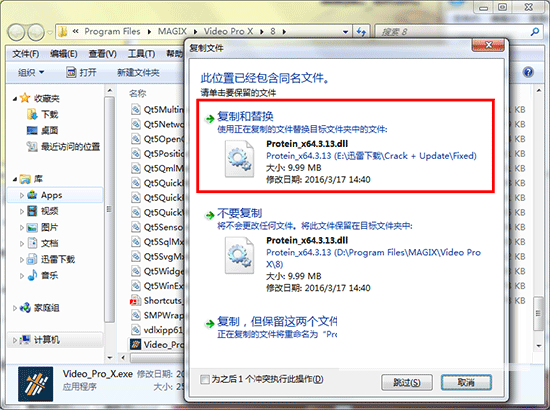 12、再将破解文件“Protein_x64.3.13.dll”,复制到安装目录下的Protein目录覆盖源文件即可完成破解,默认路径为C:\Program Files\MAGIX\Video Pro X\8\Protein