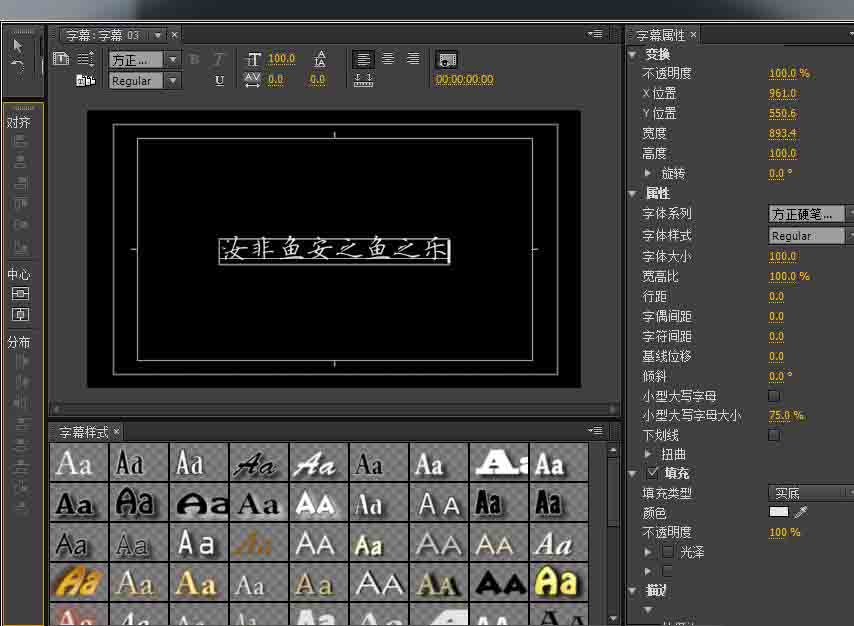5、新建一个游动字幕,在菜单栏里选择字幕——新建字幕——默认游动字幕,出现如下画面
