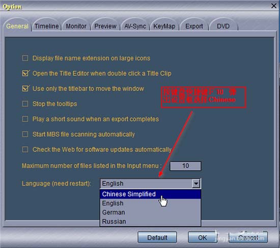 双击exe应用程序就可以启动视频剪辑软件,首次界面是英文的,按键盘上的快捷键F10,弹出设置框,如图所示,在General-Language选项这里选择Chinese,点击OK,工具会自动重启,界面就变成简体中文了。这款软件不错值得下载使用!