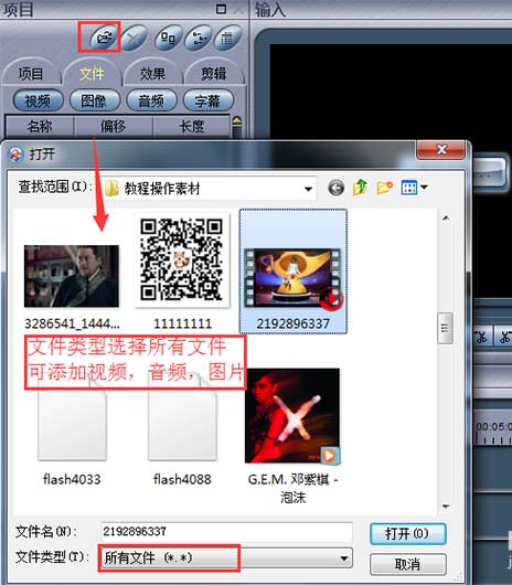 首先可以添加需要剪辑的视频,点击左上方的文件按钮,在添加文件类型这里下拉选择“所有文件”,选中文件“打开”就添加成功了,能添加视频、音频、图片文件,在左边项目这里可以看到添加的文件。