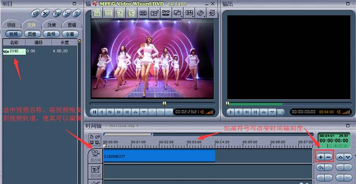 编辑视频需要将视频添加到视频轨道上面,这个大家应该在别的教程上面有看到,这个操作方法也是大同小异的,鼠标左键选中视频不松手,移动拖曳到视频轨道,如图所示,上面一条时间刻度是时间轴,初次使用的时候刻度跨越很大,可以在视频轨道的后面的加减号进行调节,视频时间较短的话可以按+号调节视频轨道长度。