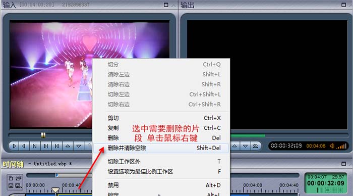 选中需要删除的片段,点击鼠标右键,选择“删除并清除空隙”,按照此方法可以删除全部不需要的视频片段。虽然删除了空隙,可以看到视频中间有一条缝隙,剩下的2个视频片段仍是独立存在的,可以单独进行编辑,这并不影响输出的视频,输出的时候会自动合并成一个视频。(两个视频中间不要留缝隙)。