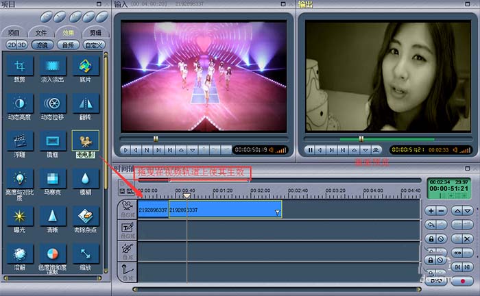 选择项目这里的“效果”按钮,可以设置3D效果哦,单独需要3D效果的,可以用 3D电影制作软件,效果也是不错的。回到正题,以“老电影”效果为例,选中它,然后拖曳到对应的视频轨道上使其生效,视频片段右下角会有白色的标记,两个视频片段可以添加不同的效果,在输出画面可以预览视频效果。