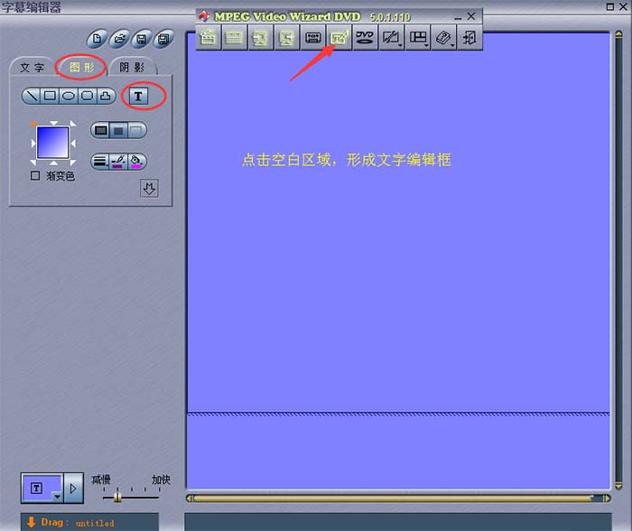 最初启动工具的时候,有个导航浮框与视频剪辑软件是分开的,将软件位置下拉一点就看到了,添加字幕就靠它喽,如图所示,选择浮框上面的“字幕编辑器”就可以启动编辑了。需要添加文字字幕的,在“图形”这里可以选中“T ”标记,再点击右边的空白区域,即可出现文字编辑框。