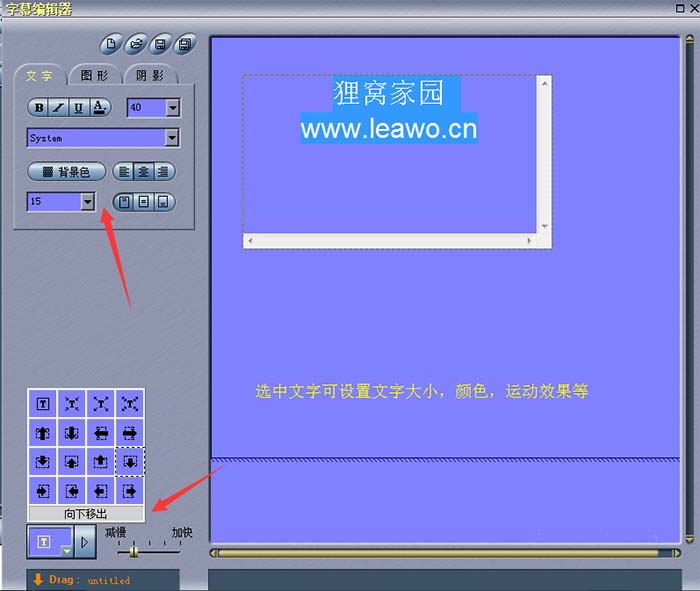在文字编辑区输入字幕,通过拖动虚线可以调整编辑区的大小,输入完成以后,选中字幕文字在左边设置文字的颜色,大小,排列位置等,左下角可以设置字幕的活动方式,有向下移出,向右移出等等,速度可以调至缓慢,看的更清楚一些。