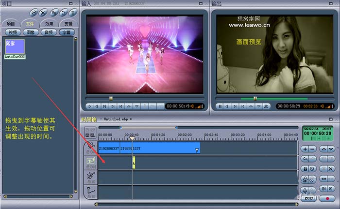 回到素材管理器这里,拖曳字幕文件到字幕轨道上使其生效,字幕轨道即第二条轨道,将字幕文件调整到对应的时间点,也可以拉长字幕轨,延长字幕的显示时间。在输出画面可以预览视频最终的效果。