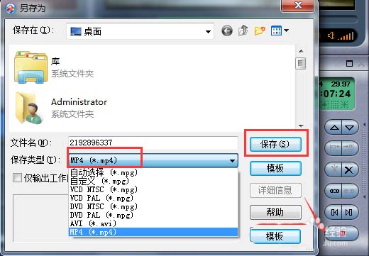 所有的编辑结束以后,就可以保存了 ,点击右下角的红色保存按钮,弹出另存为的画面,选择视频格式,支持MP4、AVI、mpg格式,然后保存。