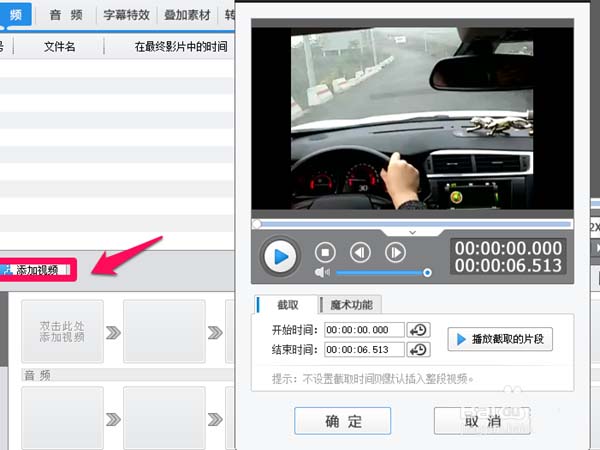 2、然后再将你要添加文字的视频导入视频源,点击确定放入视频;
