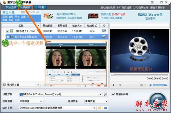 2、多个文件的时候,首先选择需要编辑的视频文件,然后单击主界面左上方的视频编辑按钮,会弹出视频编辑窗口。如图所示。