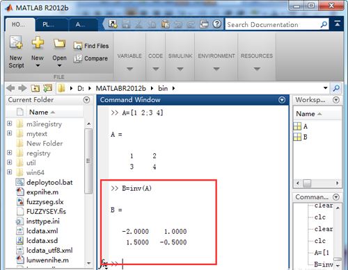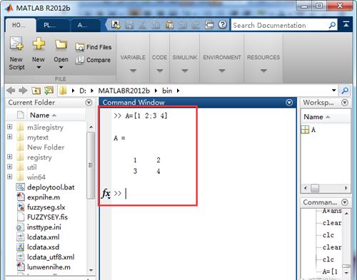 3、输入自己的矩阵,如本例中设置一个矩阵A=[1 2 ;3 4 ];
