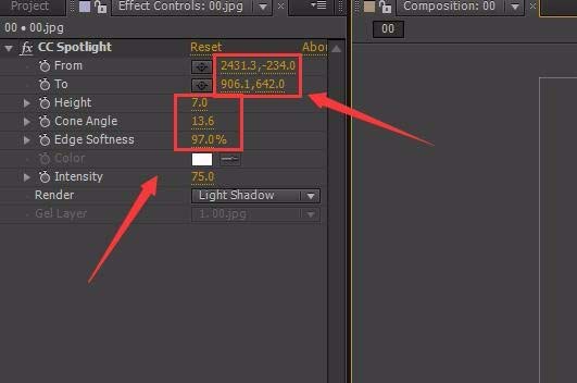 6、点击effect菜单,在其内找到perspective选项,点击perspective选项,在其下拉菜单那里找到CCspotlight选项,点击该选项,其参数设置,如图所示: