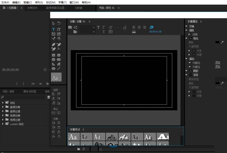 4、这时我们便进入到了滚动字幕的编辑区了,点击左边工具栏的“T”此时鼠标变成“I”型,表示可以输入字符了。
