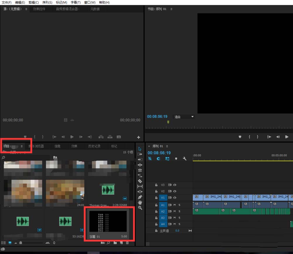 6、做完以上工作后,我们直接点击关闭按钮,关闭字幕编辑区,此时我们再从左下角“项目”中找到“字幕1”