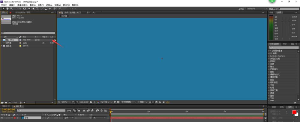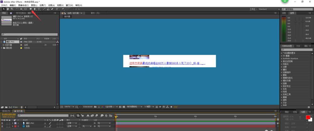4、然后我们将素材拖动至合成的上方,也就是将我们的素材放到合成当中。(这里的素材我用文字素材,是为了效果更加明显,在实际操作中其他图片也是可以 的。)