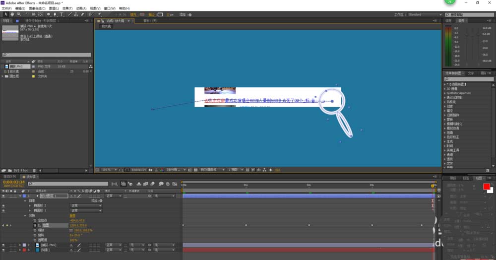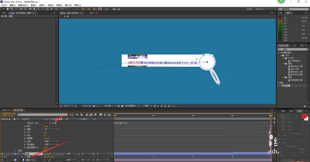 7、然后就是制作动画了,先给放大镜打上关键帧,利用位置这个属性来打关键帧。打开关键帧后,拖动放大镜,绘出移动轨迹。