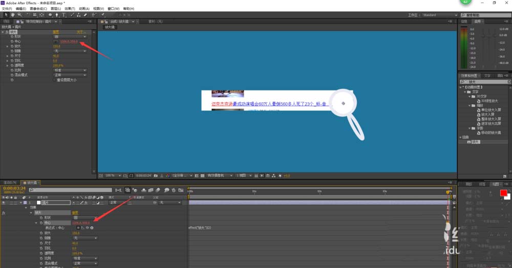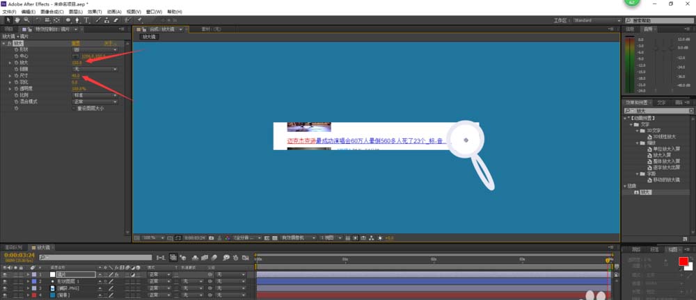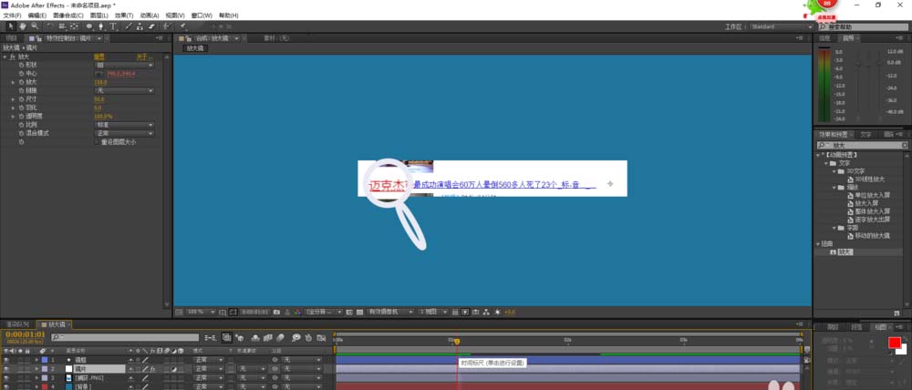 10、接下来就是添加特效了,我们在效果和预设中找到放大特效,然后将其拖拽至镜片图层中。