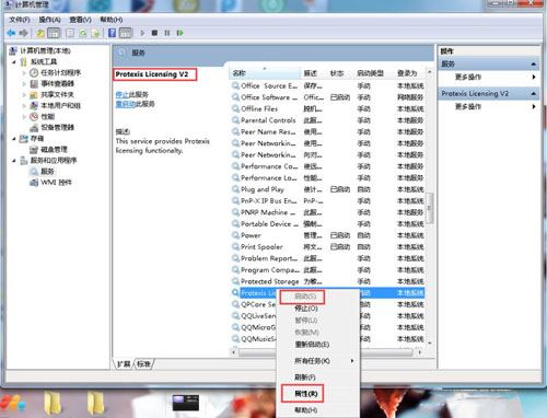 4、在服务里找到Protexis Licensing V2服务,右键点击启动,再点击属性,在属性里把它设为自动启动。都完成后重启下电脑,再打开会声会影x5.就能正常启动了.