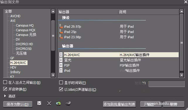 4、最后调节输出设置,输出器选择“-H.264/AVC”输出。