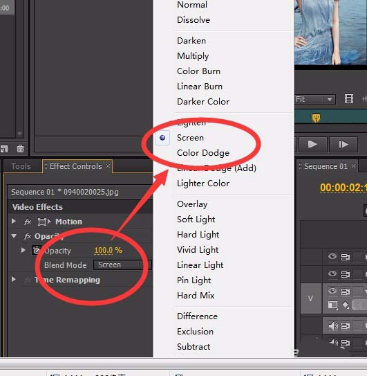 6、接着我们在树木素材的特效选项里面选择叠加方式,在【blonde mode】这个选项里面选择【screen】