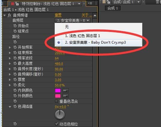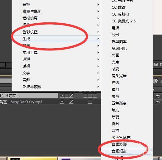 4、接着我们点击效果-生成-音频频谱,把音频层选为我们的音乐
