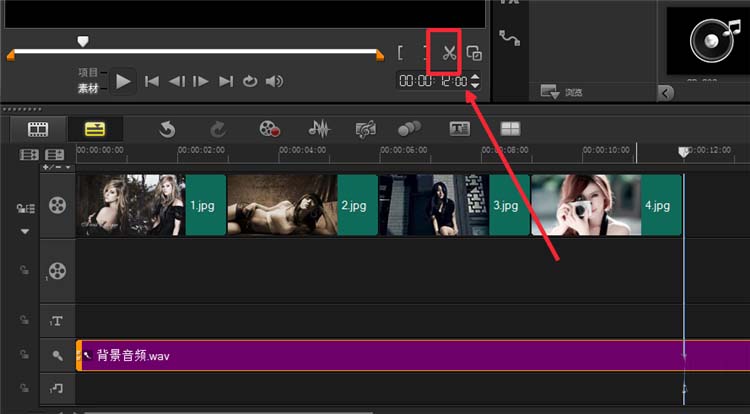 3、视屏和音乐是相辅相成的,视频或者音乐过很长都是不合适的,所以我们需要对其进行剪切。需要将多余的音乐进行裁剪。将轴线拖动到视屏的尾端,选中音频,然后点击“ 剪刀”,然后将多余的部分按【delete】键删除。