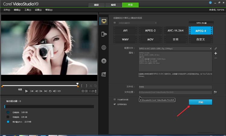 6、最后,便是生成视屏,点击【共享】,然后设置视屏格式为MPEG-4,点击开始,开始视屏的渲染。