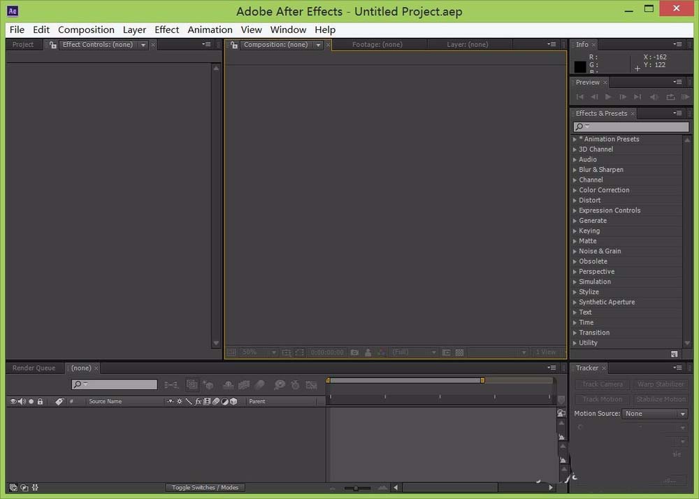 1、打开after effects这款软件,进入after effects的操作界面,如图所示:
